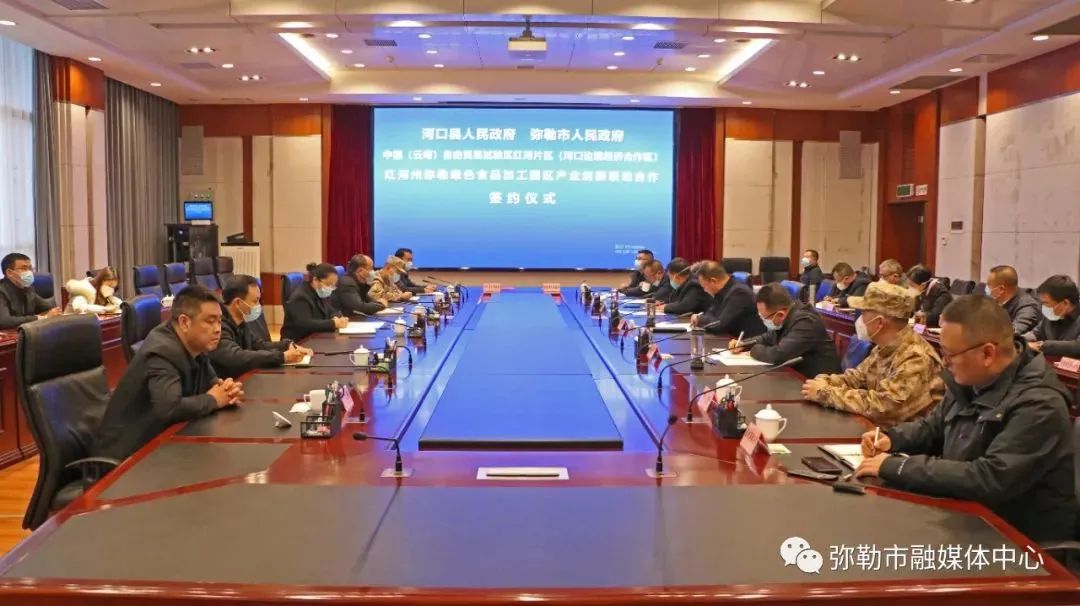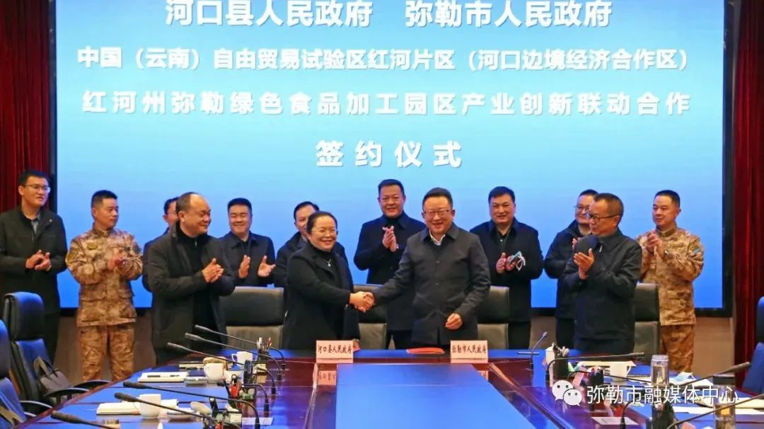 2022年12月30日,弥勒市与河口县签订红河州弥勒绿色食品加工园区、中国(云南)自由贸易试验区红河片区(河口边境经济合作区)产业创新联动合作协议。弥勒市委书记李健出席签约仪式并致辞,弥勒市委副书记、市长潘金军,弥勒工业园区管委会主任唐举顺与河口县委副书记、县长邓瑞,县委常委、常务副县长朱宏代表双方签约。