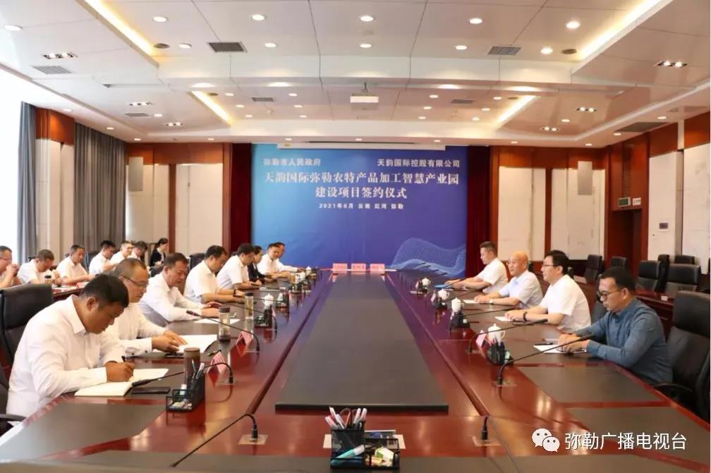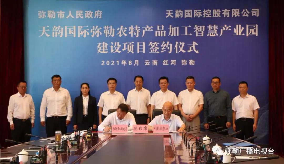 6月30日上午,弥勒市人民政府与天韵国际控股有限公司签署天韵国际弥勒农特产品加工智慧产业园建设项目。