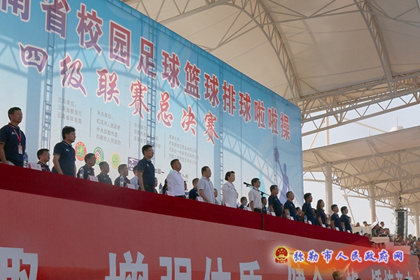 8月12日上午,2019年云南省青少年校园足球篮球排球拉拉操四级联赛总决赛在弥勒开赛。副省长李玛琳,省政府副秘书长彭耀民,省教育厅副厅长郑毅,省体育局副局长张晓憬,共青团云南省委副书记赵攀峰,副州长何民,州教体局局长张学理,市委副书记、市长梁凌云等省州市级领导出席开幕式。省教育厅体卫艺处处长徐忠祥主持开幕式。