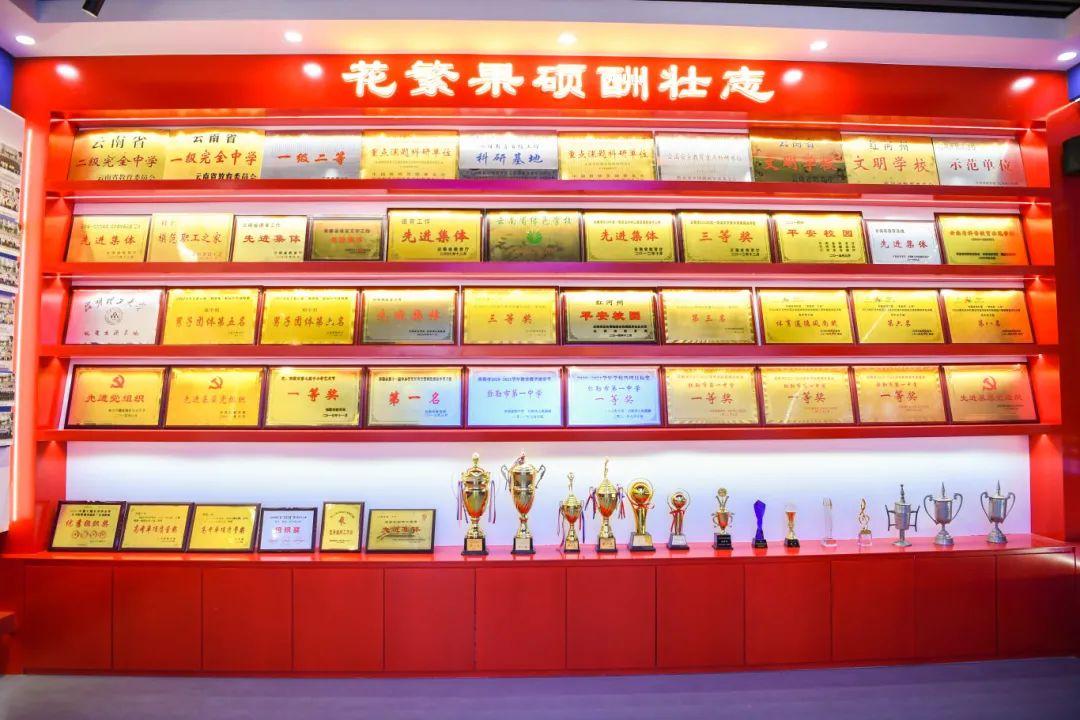 弥勒市第一中学校史展览馆通过图片、文字、奖牌奖杯、教学用具等,展示办学的丰硕成果和师生的无限风采,见证一中人的淳朴、坚守和骄傲,铭记一中的发展、崛起和辉煌。全馆按照“龙柏桂香弦歌盛”“九秩薪火铸风骨”“岁月如歌人如磐”“长路漫漫亦灿灿”“杏坛鎏金书情怀”“桃李芬芳香满园”“同窗情谊恒久远”“花繁果硕酬壮志”“阔步征程开新篇”等板块规划内容,全面真实再现90年发展足迹,勾勒学校形象,记录师生工作、学习和生活的点滴,收藏铭刻于心的故事,颂扬激昂奋进的追求。