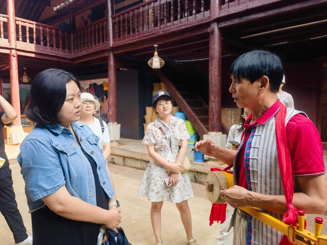 调研组首先来到东风韵艺术小镇,参观了国际艺术中心、万花筒艺术馆、半朵云艺术家会客厅和非物质文化遗产生产性保护创意馆等,详细了解弥勒非遗融入旅游空间的现状以及遇到的问题及非遗产品开发情况。随后前往可邑小镇,实地了解国家级非遗项目《彝族三弦舞·阿细跳月》和《阿细先基》的技艺保护与传承实践案例,听取文化和旅游带头人参与“非遗+旅游”助力乡村振兴的情况介绍,并就非遗传承人从事旅游工作情况等问题与传承人们进行深入交流。