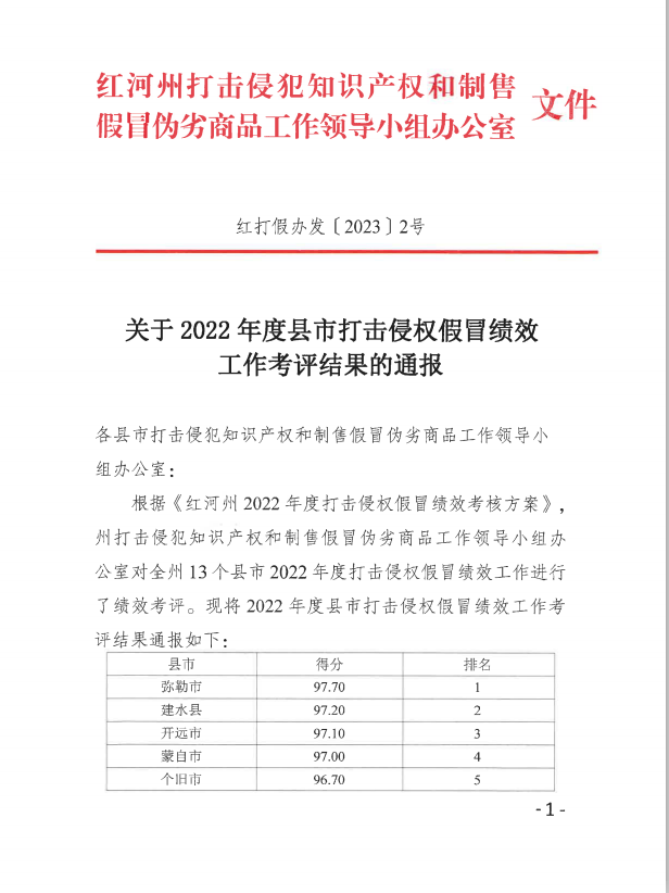 近日,红河州打击侵犯知识产权和制售假冒伪劣商品工作领导小组办公室印发《关于2022年度县市打击侵权假冒绩效工作考评结果的通报》,弥勒市荣获红河州2022年度县市打击侵权假冒绩效工作考评第一名,这是继2020年和2021年后再次获此殊荣,成功实现了“三连冠”。