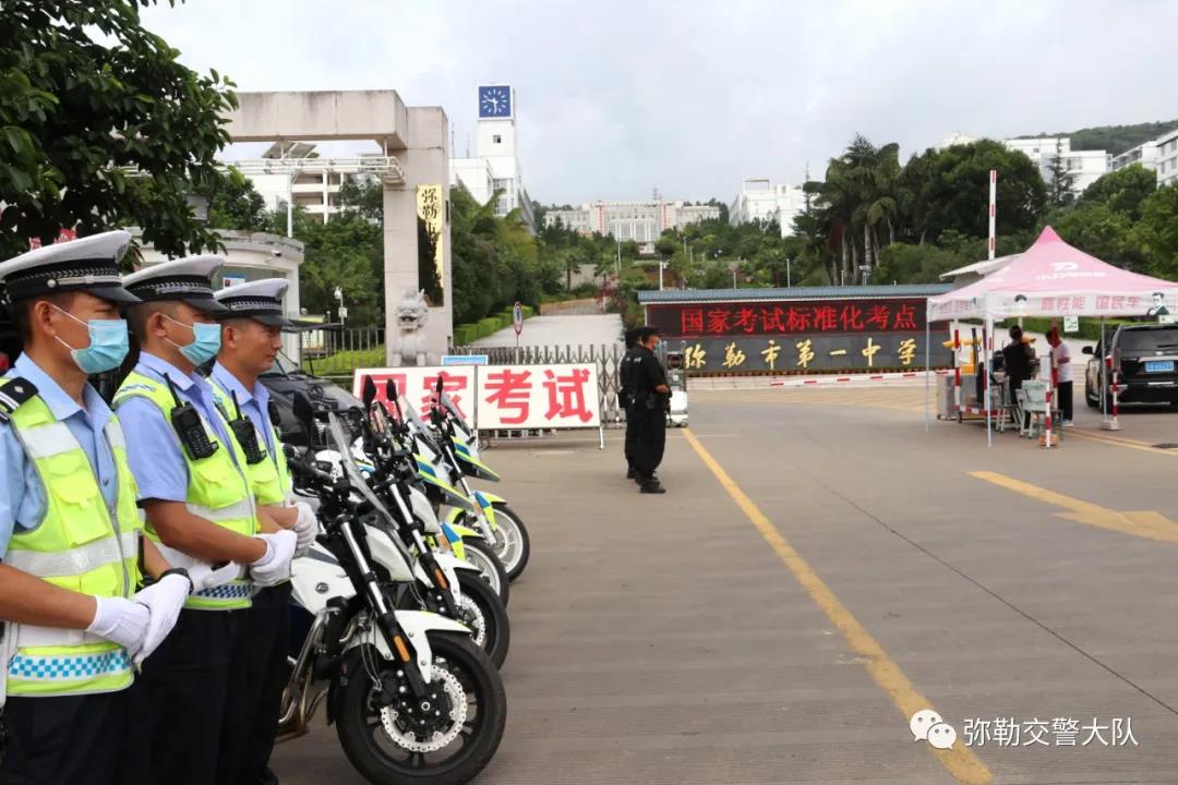 7月7日,2020年高考第一天,弥勒市3051名考生在弥勒一中、庆来学校参加考试。弥勒市公安局交警大队组织警力全程护考,全力做好考生接送路线和考点、驻地周边道路交通秩序维护,确保接送考生车辆准时到达考点,路途行车安全有序。