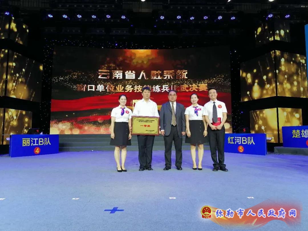 经过秀我风采、争分夺秒、群策群力、勇往直前四个环节的激烈比拼,弥勒市人社局作为红河州代表队以559.6分喜获全省人社窗口单位业务技能练兵比武总决赛一等奖,同时代表队选手刘乙个人获“最佳选手”、“全省人社知识通”奖项。