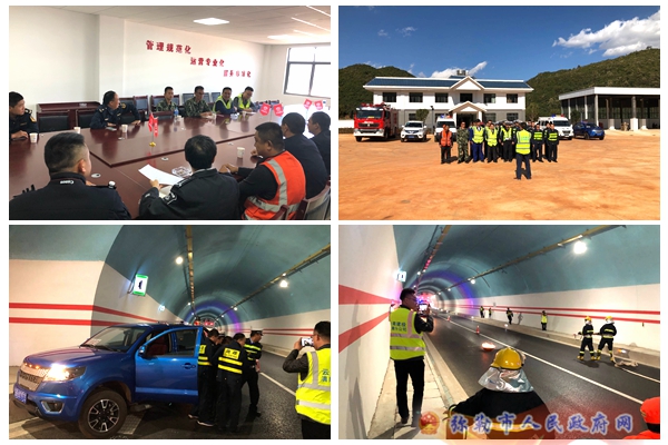 在泸弥高速公路小塘隧道上行线弥勒东方向入口K48公里处演练模拟车辆在隧道内发生事故后起火的处置情况。