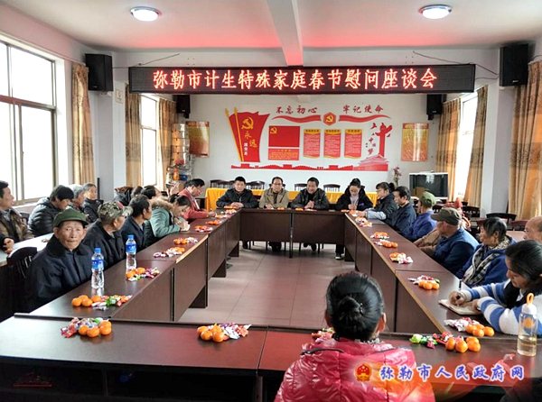 1月16日,弥勒市卫计局、市计生协会联合弥阳镇在禄丰社区召开红烟、大树、禄丰、雨舍五个社区、村委会16户计生特殊家庭代表慰问座谈会,更好地服务计生特殊家庭,让计生特殊家庭感受到党和政府的温暖。