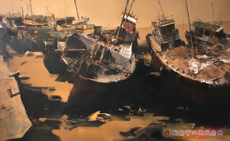《静静的码头》系苗蕊老师经过历时一年的采风、写生、构思、小稿推敲,最后到形成创作。作品画面以暗黄色调为主,表达了码头及船只在历尽沧桑过后一切回归平静的主题,同时也是对人生的一种感悟和思考。