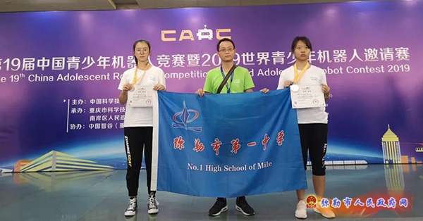 在第19届中国青少年机器人竞赛暨2019年世界青少年机器人邀请赛中,弥勒市第一中学代表云南省参赛,教练员李增耀带领李敏嘉、保雅涵两位同学在连续5天的艰苦训练与比赛奋战中,经受多重考验,与强大的竞争对手同台竞技,最终荣获第十九届中国青少年机器人竞赛教育机器人工程挑战赛高中组二等奖。