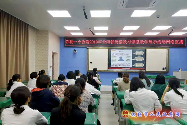弥勒市第一小学为推进义务教育课堂教学改革,更新教育观念,推动教与学方式转变,促进教师的专业发展。近日,学校组织115名教师观摩学习国家统编“三科”教材课堂教学展示网络直播。
