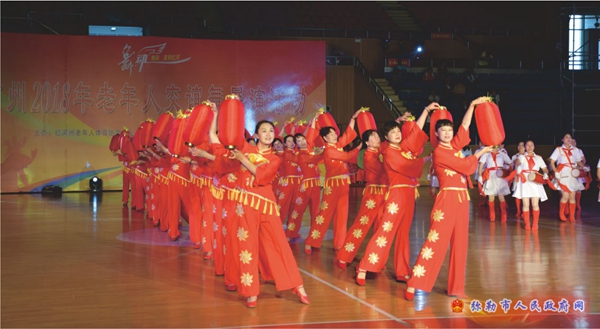 图为开幕式上市老体协文艺队表演的舞蹈《中国梦﹒弥勒红》文艺节目