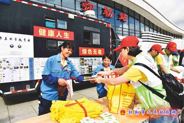 6月26日是第31个国际禁毒日,为进一步净化我市环境,提升群众远离毒品、拒绝毒品意识,营造全民禁毒的良好氛围,我市禁毒委员会及有关部门工作人员走进弥勒高铁站,开展以“健康人生,绿色无毒”为主题的“6.26”国际禁毒日宣传活动。