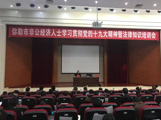 为深入学习贯彻党的十九大精神,坚定不移以习近平新时代中国特色社会主义思想为指引,引导弥勒市广大非公经济人士坚定理想信念,诚信守法经营,促进“两个健康”发展。12月13日,弥勒市委统战部、市工商联联合举办了2017年非公经济人士学习党的十九大精神暨法律知识培训。弥勒市各乡镇商会会长、商会专干,市工商联执委,各行业商会代表,非公经济代表人士,市委统战部、市工商联干部职工等共计200余人参加了培训。