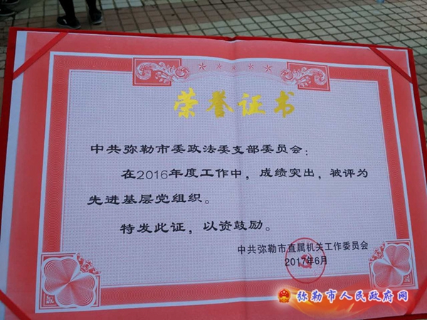 2011年至2017年,弥勒市委政法委党支部多次被评为“先进基层党组织”,支部多名党员被授予“优秀共产党员”和“优秀党务工作者”荣誉称号。2017年4月弥勒市委政法委党支部被弥勒市直机关工委评为“党风廉政建设责任制工作优秀单位”;同月,弥勒市委政法委被州委政法委评为“红河长安网群建设工作优秀单位”;5月被州委政法委评为“首届平安中国微电影微视频比赛优秀组织单位”;6月铁路护路防洪工作被省护路办通报表扬; 2012年至2016年弥勒市连续5年被命名为省级“先进平安县(市)”;2010年至2016年连续7年综治维稳(平安建设)工作被州委、州政府评为一等奖。弥勒市委政法委党建工作不断夯实,综治维稳、依法治市、执法监督、护路联防等各项工作在不断创新中取得明显成效。