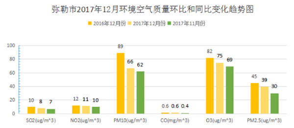 入冬以来,极易发生连续多日的静稳天气,造成污染物积聚,难以扩散,再加上冬季降水减少,我市12月份细颗粒物连续超标4天。与上月相比,优良率下降了12.9个百分点,污染物浓度均有所上升,与去年同期相比,虽然超标天数增加了1天,但污染物浓度除臭氧外均有所下降,说明弥勒市环境空气质量与去年同期相比还是有所改善。