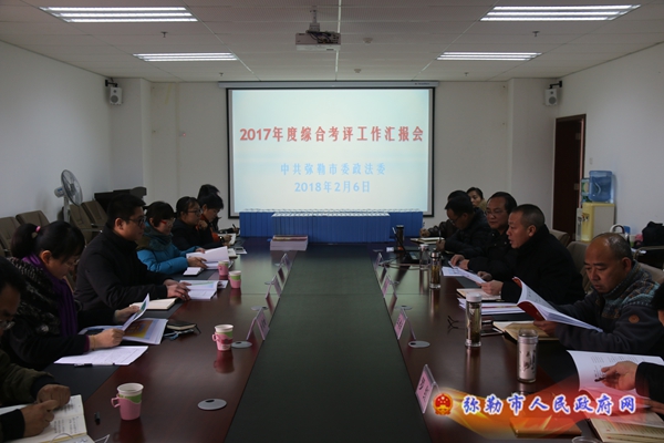 2月6日下午,弥勒市2017年度综合考评工作第二考评组到弥勒市委政法委,对2017年度制度建设、工作落实、机关作风、办事公开、党的建设、社会评议、领导评价、表彰奖励和创新等综合工作进行考评。