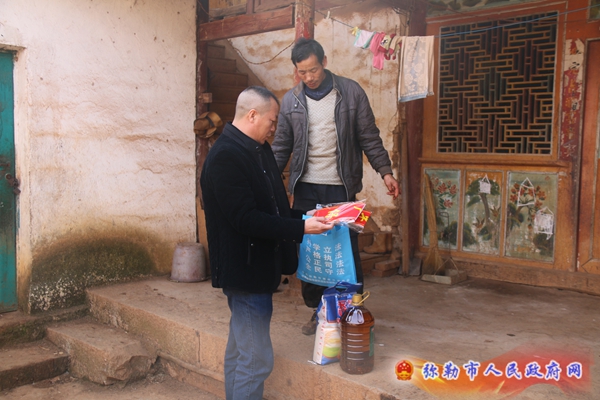 张俊忠一行分四组分别到乌衣村小组、大凹子村小组、石万村小组和围锁村小组对村两委干部及78户挂联贫困户进行走访慰问。各挂联干部为各自挂联户送去米、油和春联,表示对春节的慰问和祝福,并以此为契机发放平安弥勒、法治弥勒宣传手提袋和宣传资料进行平安法治宣传。每到一户,各挂联干部都与他们面对面交流,拉家常、送祝福,详细询问近期的生产、生活、务工、教育、医疗等方面的情况和遇到的困难,了解他们的身体状况及其家庭成员状况,并立足自身职能,结合党委政府的扶贫政策,为其出谋划策,尽最大能力为其提供支持和帮助,鼓励其克服困难、坚定生活信心,保持积极乐观的态度,努力改善家庭生产生活条件,早日实现脱贫致富。同时,还叮嘱他们在春节期间要注意加强人身、财产、交通、防火等方面的安全意识,注意防寒保暖,确保每一个贫困户都能度过一个安定、祥和、欢乐的春节。