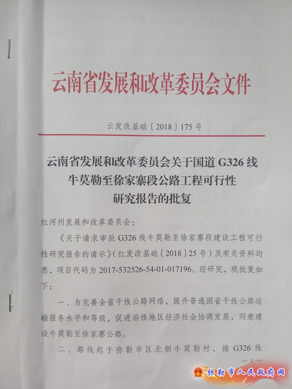 国道G326线牛莫勒至徐家寨段公路线路起于弥勒市北侧牛莫勒村,接G326线K1206+100,经焦化厂、新安村、慈云洞村、弥勒工业园区规划区东侧,至于弥勒市区南侧、火车站规划区东侧、工业园区规划区西南侧,接G326线K1222+200。路线全长17.56公里。全线按四车道一级公路标准修建,设计时速80公里,路基宽度25.5米,桥涵设计汽车荷载等级采用公路—Ⅰ级,全线设置大桥7座,小桥2座。估算投资83747.11万元。该项目建成后可让过境客货运输车辆避开主城区内部交通干扰,实现区域对外主干路网便捷相连接,有利于提高区域主干路网连通度,对增强区域公路网运营能力具有重要的作用,从而提高整个综合运输网络的运行效益,缩短人们的出行时间,降低物流成本,提高综合运输体系的总体效益和服务水平,使当地通道资源得到高效利用,给当地居民带来更好的经济效益。