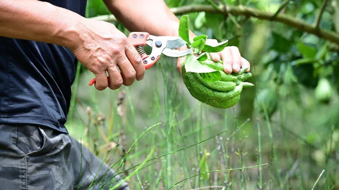 在佛手柑种植基地,工人们熟练地用剪刀将成熟的佛手柑摘下,进行分拣、打包……一派繁忙的丰收景象。