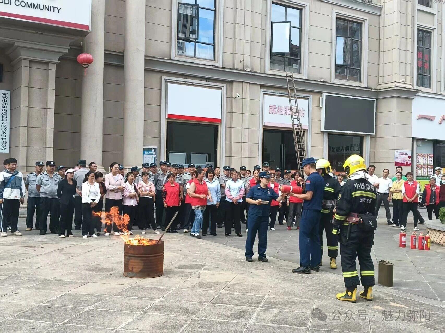 为提升居民消防安全意识与逃生自救能力,筑牢安全防线,近日,弥阳街道执法队联合弥勒市消防救援大队、15个社区消防协管员、万丰物业到福地社区开展院坝消防培训及演练、检查。
