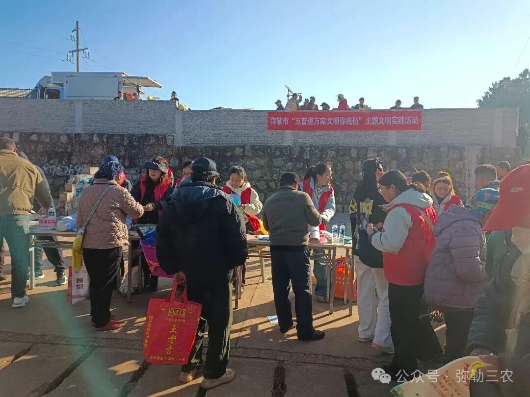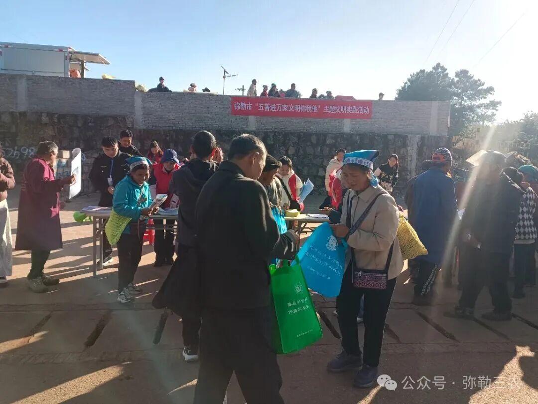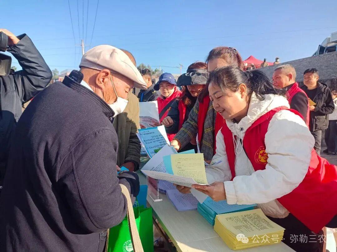 为深入贯彻习近平法治思想,推进法治乡村建设,增强基层群众法治意识,助力乡村振兴战略,结合“五普进万家 文明你我他”普法宣传活动,2025年11月25日弥勒市农业农村局组织农业技术推广、机械服务、植保、畜牧、动物卫生监督(疫病预防)及农业综合执法大队等志愿服务队在西一镇油榨地开展涉农政策法规宣传,通过“面对面”普法、“零距离”服务,切实提升农民群众法治获得感。