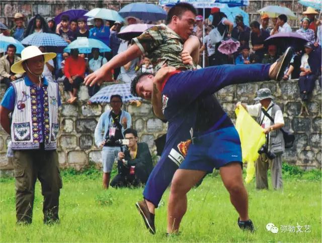 当火把梨压弯树枝、火把果染红山坡的时节,彝家人最隆重最盛大的节日——农历六月二十四日的“火把节”来到了。庆祝这一节日的核心内容是摔跤运动会。跤场大都择一处四面群山环绕、有两个足球场那么大的山洼。当日的跤场如一个大舞台、大乐池、大农贸市场。身着盛装、肩披彩带的彝家人吹响了过山号,跳起了粗犷的刀叉舞,耍起了千变万化的霸王鞭。当然,“主打”舞蹈是阿细跳月。男人肩上都挎一把用松木或冬瓜木掏空做成的大三弦。用什么来形容大三弦的声音?我想到山呼、海啸、奔雷、狂飙、怒号。我听着它,明白了什么是大音稀声,明白了什么是大山的心跳。这是生命的律动,而生命的律动,就是大地的律动。他们一弹起它,像接到什么命令似的,他们的对面会出现打扮得花一样的阿细女子,她们佩戴的耳环和脚圈发出悦耳的轻响,与大三弦声、竹笛声共鸣。这乐声乍乍地猛传开来,长长地流泻到山地,滚动在林野,吸引着无数双爱美的耳朵和眼睛。三弦声、竹笛声,掌声,脚步声,造成了其表现上的多声部的复调效果,就像一条波澜壮阔、一泻千里的大江,在无拘无束地发出自己的声浪。那年“火把节”,我曾与一个阿细老者同路去赶跤场。他看上去快70岁了,牙齿没有几颗了,走路气喘吁吁。可他挎着一个硕大的三弦。我以为他是给儿子捎去的。到了跤场,像一滴水,他自然地汇入了跳月的人海。后来我得知,跳月是阿细人做人最体面的事情,凡在村里受人敬重的人,有哪一个不是跳月的佼佼者呢。跳月,没有功利,而是为了歌颂人生、生活,是对脚下的大地深深的感恩。