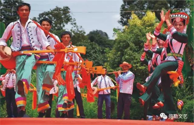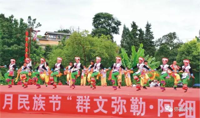 弥勒民族众多,风情万种,千姿百态,但就像一条长河,不断地分出岔去,又不停地接上头,成为河流,并日益丰盈。几年前秋季的一天,我到彝族居住的巡检司镇龙树村做客。在同事普佳勇家吃过丰盛的晚餐,天就黑严实了。这时有舞曲从村中心飘来,循声走去,但见村头的晒场上彩灯闪烁、人影绰约。走进了,只见男女老少皆舞,大家汗淋淋的、笑呵呵的,砍柴的脚板、牧牛的脚板、背草运肥的脚板、犁地的脚板、扛石头的脚板、撵狐狸的脚板,把水泥地板跺得震天价响,使轻柔的舞曲融进一种明快和力量。男人们用三弦、四弦、二胡、笛子、木叶奏起乐曲,女人们围成一圈跳起来,她们双手搭于胸前下摆,右手心贴在左手背四指上(或轻握三指),两手虎口相交,掌心对身,围而右起,反时针旋转,进三步点半步退,如此循环。她们身上缀满的饰品,随着那种热情奔放的舞步,左摇右摆,煞是好看。随后,她们口里吟唱起“爱佐、爱莎来果哩……”、“爱佐、爱莎热结……”(“来果哩”是“出来玩”、“热结”是“热热闹闹”的意思)。声音像山涧淙淙的溪流。至高潮,换步单进,交叉转身拍掌,男女成对,互衬起步,尾声时,有领唱众合,一男对一女,众男对众女,且舞且歌,如痴如醉,阿哲民乐“爱佐与爱莎”的旋律轻柔如月光,女人们像仙女一样花枝招展,飘飘欲仙。