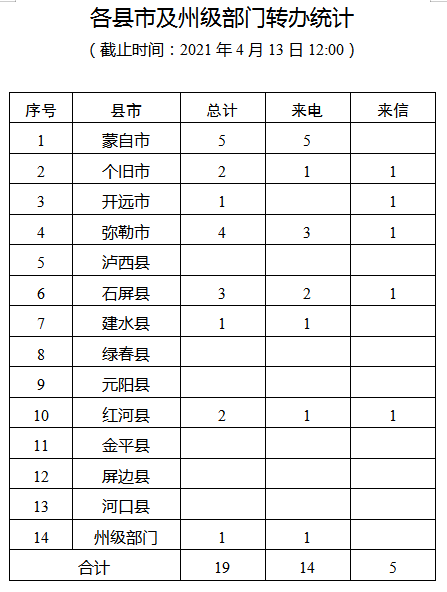 截至4月13日,省边督边改组转办群众举报投诉生态环境问题共六批19件,涉及县(市)7个;州级有关部门1件,蒙自市5件,弥勒市4件,石屏县3件,个旧市、红河县各2件,开远市、建水县各1件;其他县(市)尚未收到举报件。