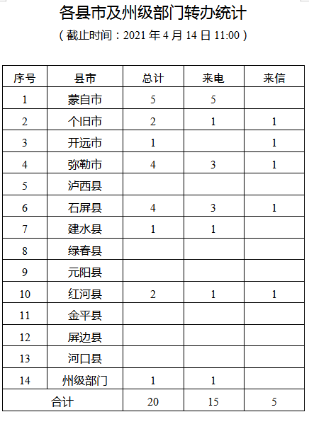 截至4月14日,省边督边改组转办群众举报投诉生态环境问题共七批20件,涉及县(市)7个;州级有关部门1件,蒙自市5件,弥勒市、石屏县各4件,个旧市、红河县各2件,开远市、建水县各1件;其他县(市)尚未收到举报件。