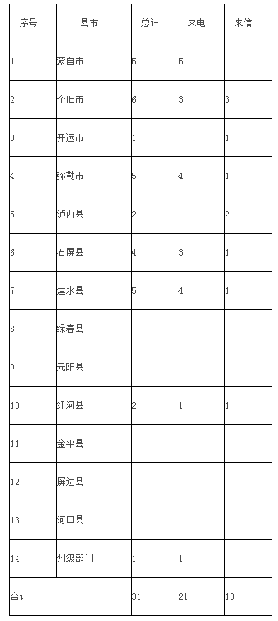 截至4月17日,省边督边改组转办群众举报投诉生态环境问题共十批31件,涉及县(市)8个;州级有关部门1件,个旧市6件,蒙自市、弥勒市、建水县各5件,石屏县4件,泸西县、红河县各2件,开远市1件;其他县(市)尚未收到举报件。