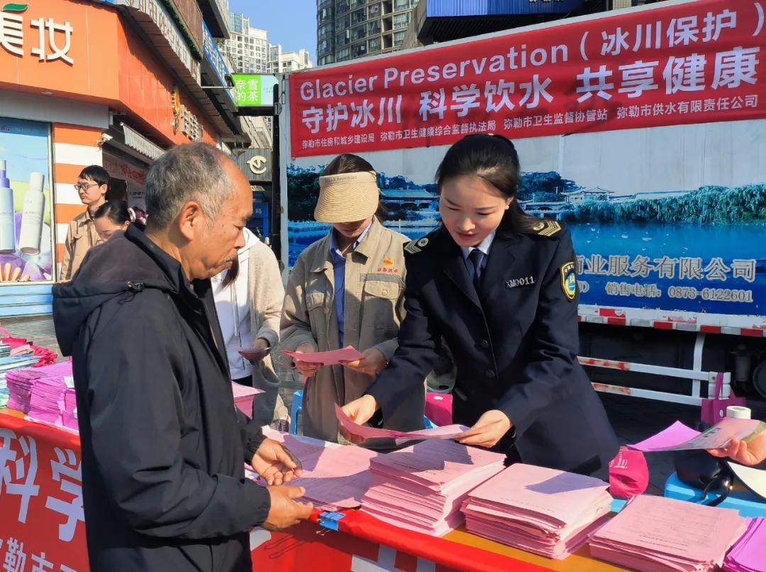 在第三十二届“世界水日”及第三十七届“中国水周”到来之际,3月25日,弥勒市卫生健康综合监督执法局联合弥勒市供水有限责任公司,在弥勒市金辰时代广场组织开展“守护冰川 科学饮水 共享健康”主题宣传活动。
