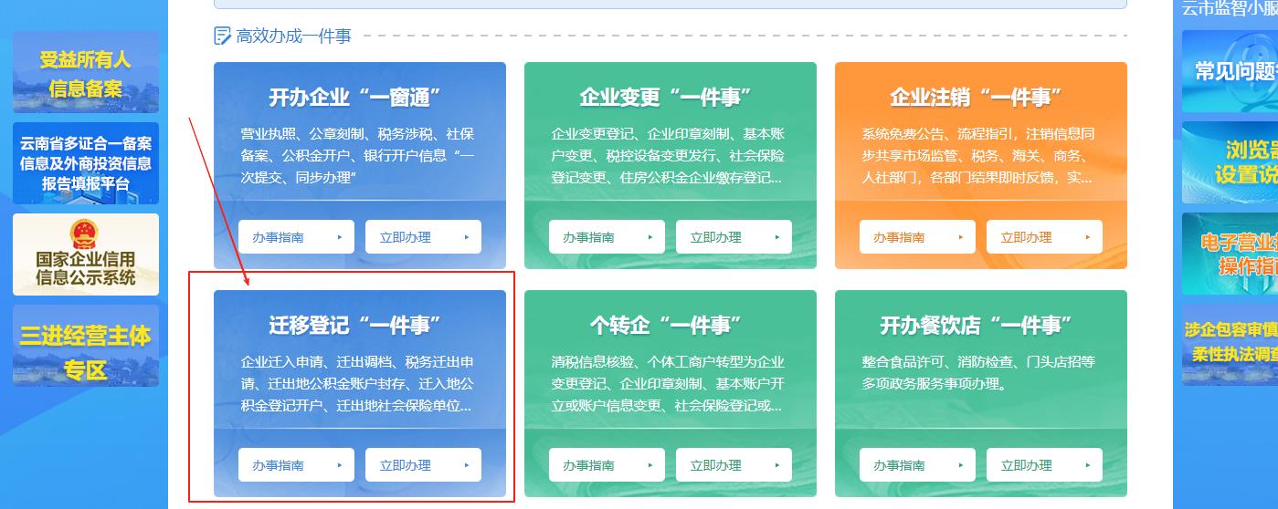 企业迁移登记“一件事”通过打通层级、地域、部门、系统之间屏障和壁垒,全面实现互联互通、数据共享。线下设立“企业迁移登记一件事”专窗,提供咨询、答疑、受理等“一站式”服务。线上依托云南政务服务网,将原本分散在市场监管、税务、社保、公积金等部门的多个事项整合为“一件事”办理,实现“一窗受理、并联审批、限时办结、一窗出件”,有效解决企业迁移登记“往返跑”难题,变“群众跑”为“数据跑”,让企业真正实现“无忧搬家”。