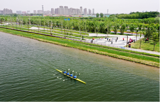 山西皮划艇队队员在汾河太原城区晋阳桥段水面上训练(2020年5月12日摄,无人机照片)。新华社记者 曹阳 摄