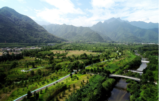 这是2019年7月26日拍摄的陕西省西安市长安区秦岭违建别墅拆除后建设的秦岭和谐森林公园(无人机照片)。新华社记者 刘潇 摄