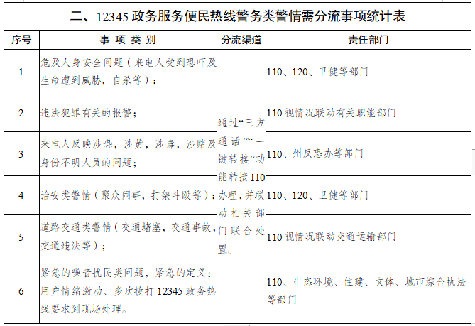 12345热线或者110通过电话接到明确属于对方受理范围内的事项,以一键转接方式及时转交对方受理。责任单位不明确或者职责交叉的,可以通过三方通话(诉求方、12345热线、110)方式了解具体诉求后,由12345热线与110协商确定受理平台,对协商后仍无法确定的,由首先接到企业和群众诉求的平台先行受理,对于存在危及人身和财产安全、公共安全的紧急求助事项,由110及时派警先行处置。12345热线或者110通过互联网、短信等其他渠道接到明确属于对方受理范围内的事项,可由州市两级平台在线转交相关部门或单位进行办理。对明确不属于12345热线与110受理范围的事项,110接线平台话务人员要做好合理引导和解释工作。