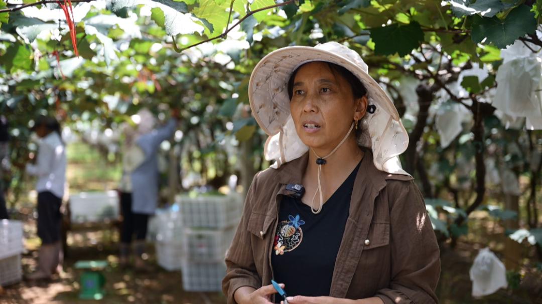 【小平地社区村民 刘琼惠】:我家种了10亩水晶葡萄,最近先摘一批去酒厂卖,过段时间套袋的成熟去市场卖。亩产可达2.5吨,日均采摘1吨。